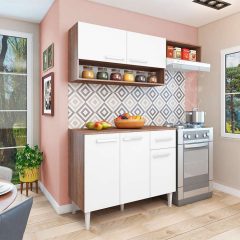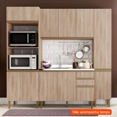 Fora da linha da cuba, pode-se ter os balcões com gavetas ou prateleiras e armários aéreos de maior altura. Já os nichos de menor altura são destinados a aproveitar a área sobre a geladeira e a coifa.